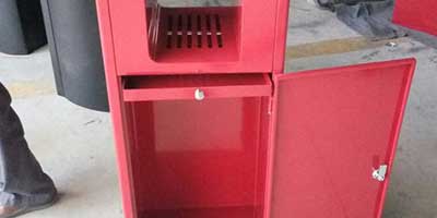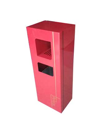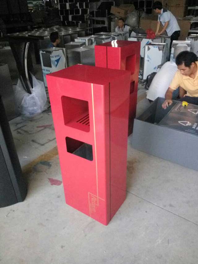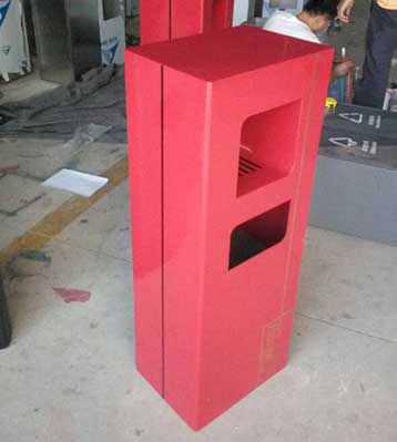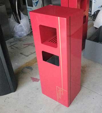 欣方圳鋼板沖孔室內(nèi)單桶中國(guó)紅噴塑造型,側(cè)面開(kāi)門(mén)以保證不影響美觀,也方便工人方便清理垃圾