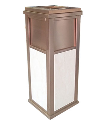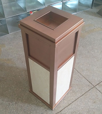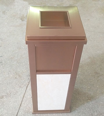 • 產(chǎn)品材質(zhì):高檔公寓鈦金垃圾桶采用天然的大理石與優(yōu)質(zhì)冷軋鋼板或不銹鋼鋼板制作而成,四面大理石用鋼板螺絲固定于桶體,有內(nèi)桶,方便提倒垃圾,桶頭煙灰盅可放白石子可清洗,鋼板經(jīng)折彎沖壓一次性成型。產(chǎn)品一律用室外粉靜電噴塑,經(jīng)過180°的高溫,延長垃圾桶使用壽命,顏色持久不變亮麗如新。